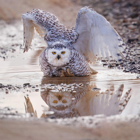 A female snowy owl hovers to reposition on a log perch while wintering on the Maine coast from their home range in the Arctic.