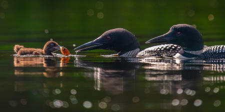 A common loon (Gavia immer) is chased by another in an apparent territorial dispute on a Maine lake.